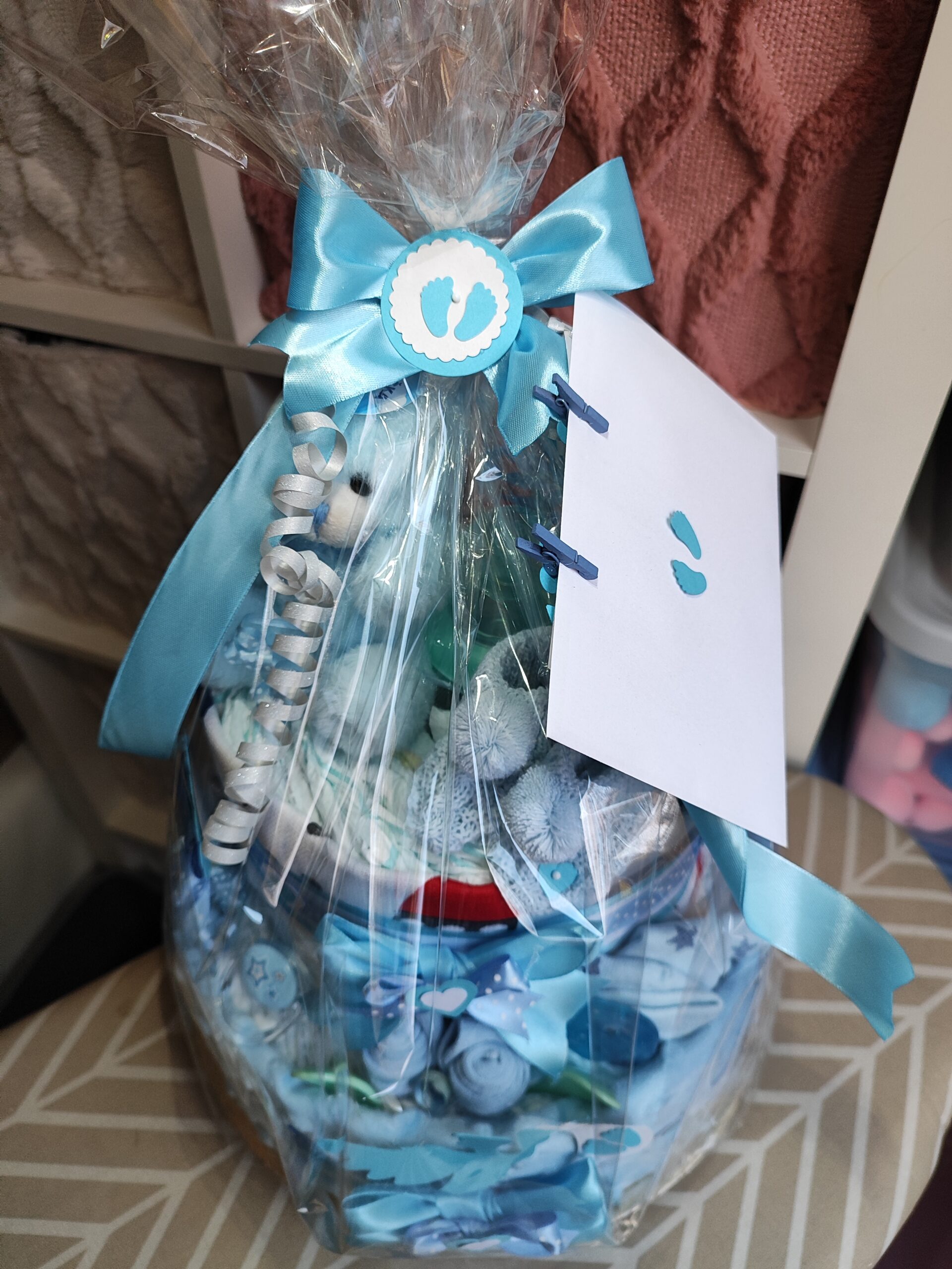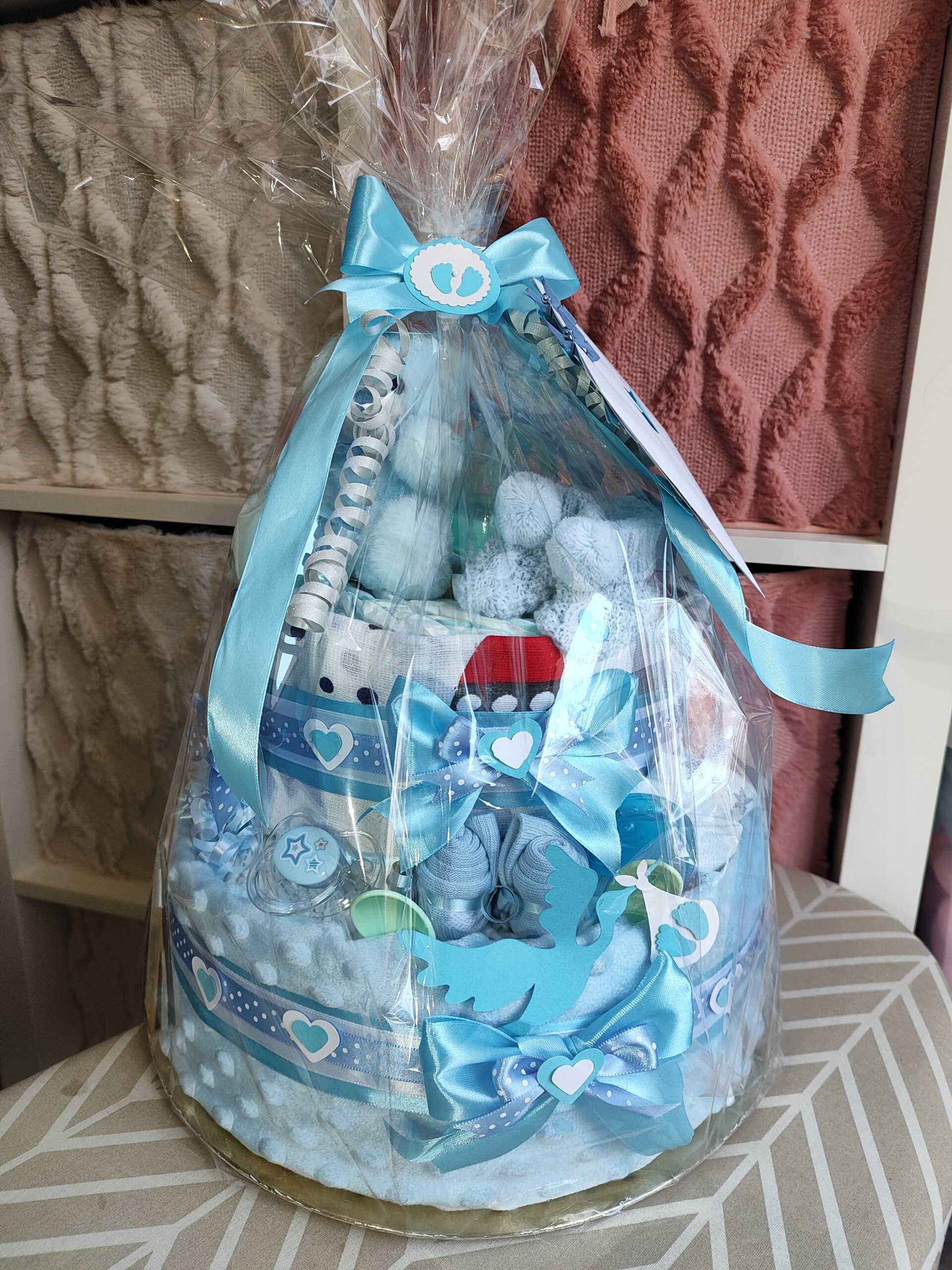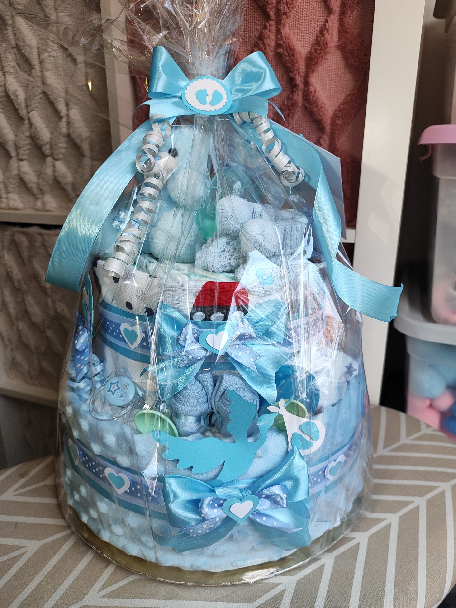 - mašle, stuhy, dekorácie, servírovaný na tortovej podložke a darčekovo zabalený v celofáne s mašľami