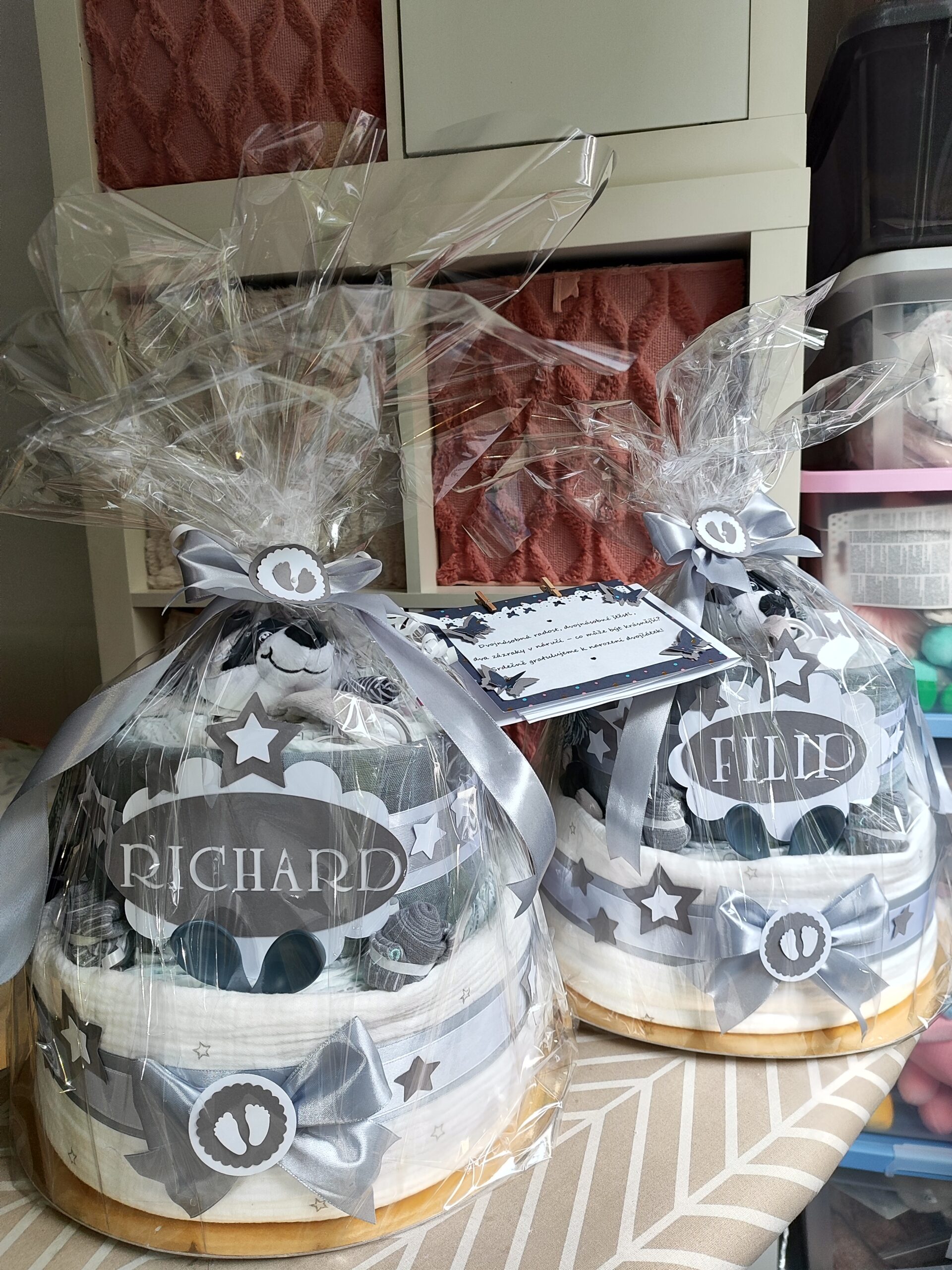 Plienkové torty sú servírované na tortovom podnose, ozdobené mašľami, stuhami a dekoráciami a darčekovo zabalené do celofánu. Vďaka tomu sú pripravené rovno na odovzdanie ako krásny darček pre mamičku aj bábätká. Súčasťou balenia je aj venovacia kartička s možnosťou vlastného textu. Do poznámky v objednávke stačí napísať text, ktorý chcete na kartičku uviesť.