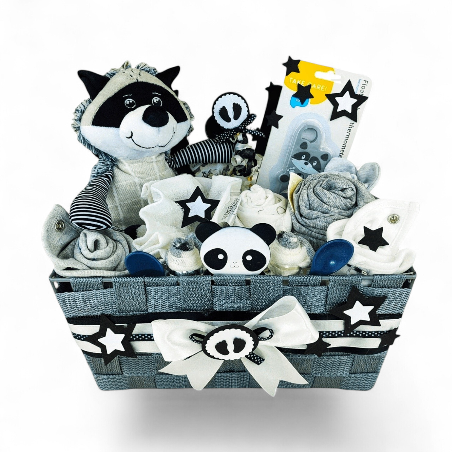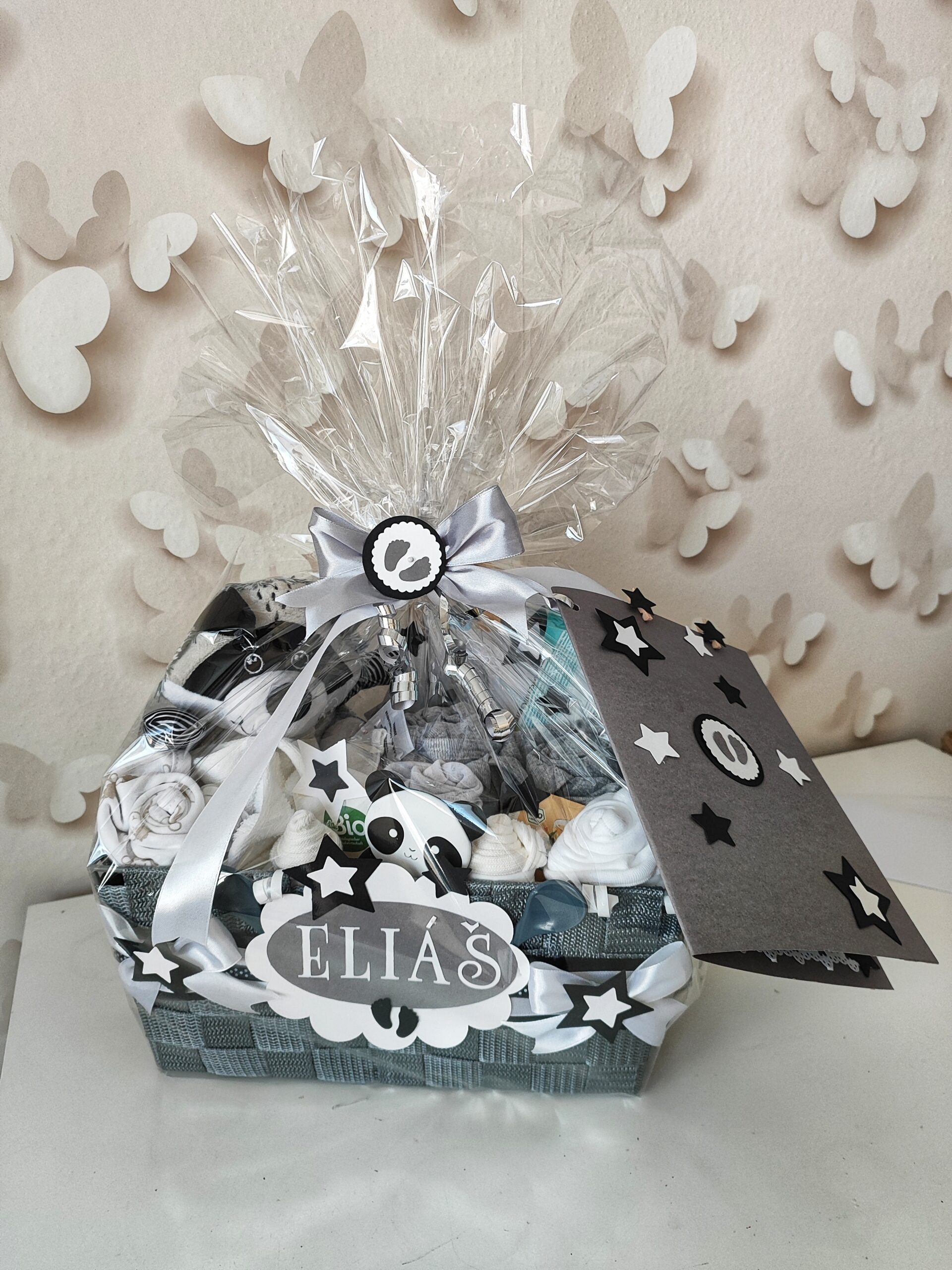 Hotový darčekový kôš je ozdobený mašľami, stuhami a dekoráciami a darčekovo zabalený do celofánu. Vďaka tomu je pripravený rovno na odovzdanie ako krásny darček pre mamičku aj bábätko. Súčasťou balenia je aj venovacia kartička s možnosťou vlastného textu.
