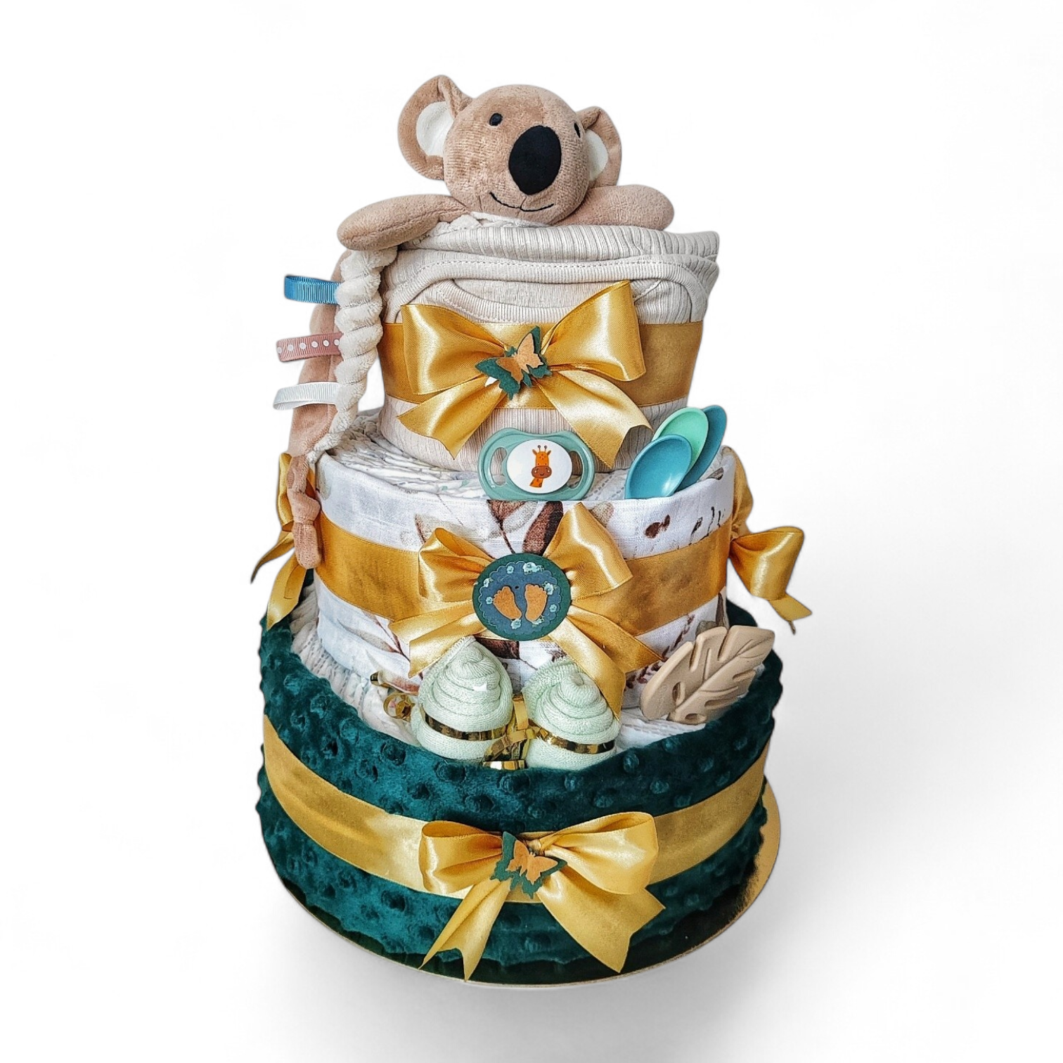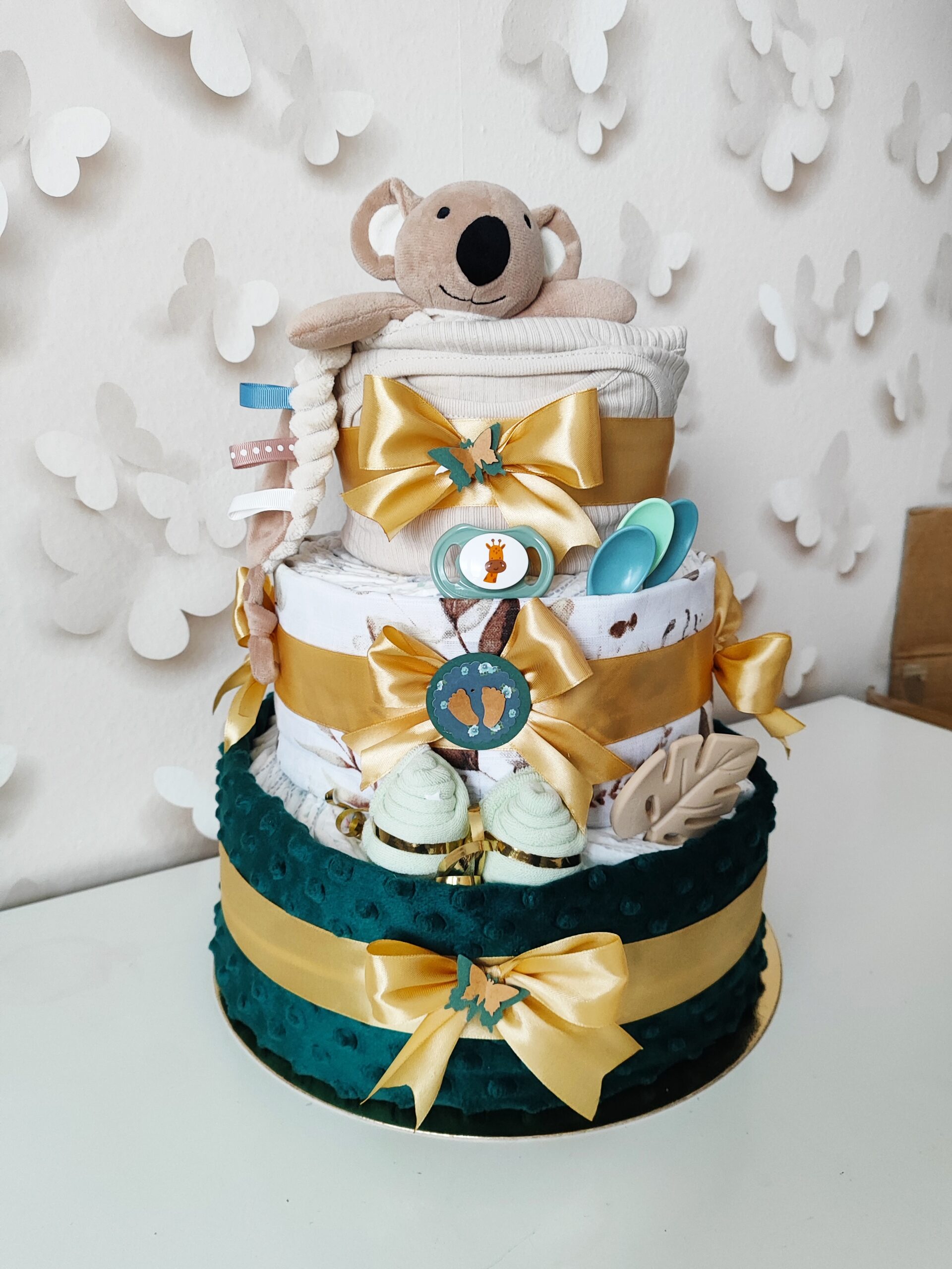 Túto plienkovú tortu s roztomilou koalou si jednoducho zamilujete. Plienková torta pre bábätko zladená do elegantných odtieňov béžovej a hnedej je krásnym a zároveň praktickým darčekom pre novopečenú mamičku, ktorá ocenia kvalitnú a bohatú výbavu pre svoje bábätko.